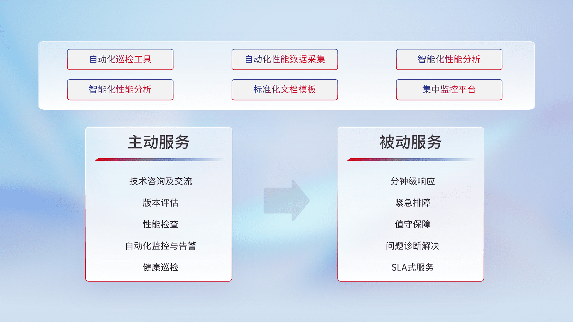 智能化工具和标准化文档,,,,保障服务质量,,提供主动服务(包含技术咨询、、、版本评估、、、、性能检查、、、、自动化监控与告警、、、、健康巡检)和被动服务包含(分钟级响应、、、、紧急排障、、、值守保障、、问题诊断解决、、、、SLA服务)。。。