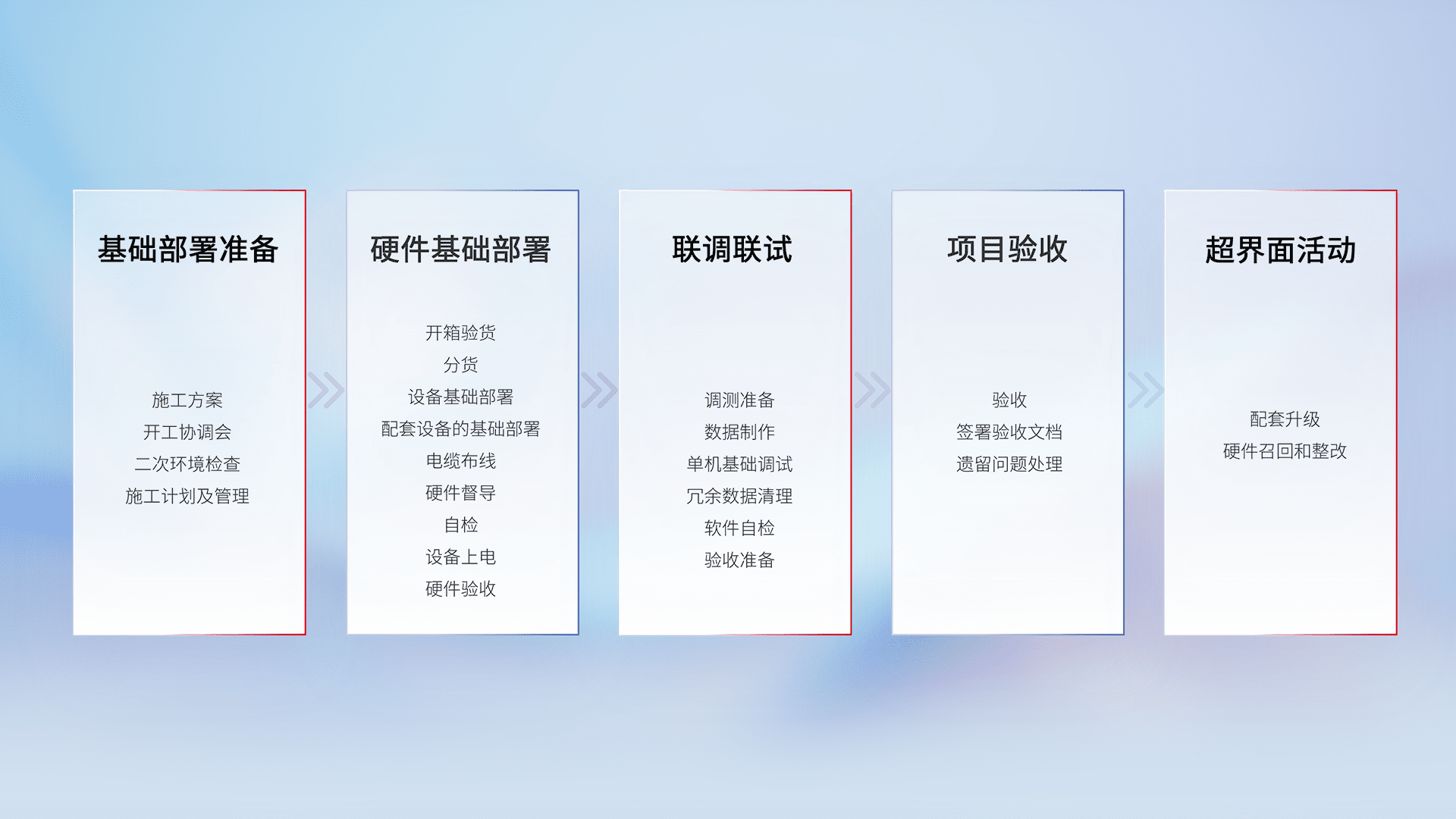从基础部署准备、、硬件基础部署、、联调联试、、、项目验收、、、越界面活动的全过程可追溯,,保证施工质量和进度。。。